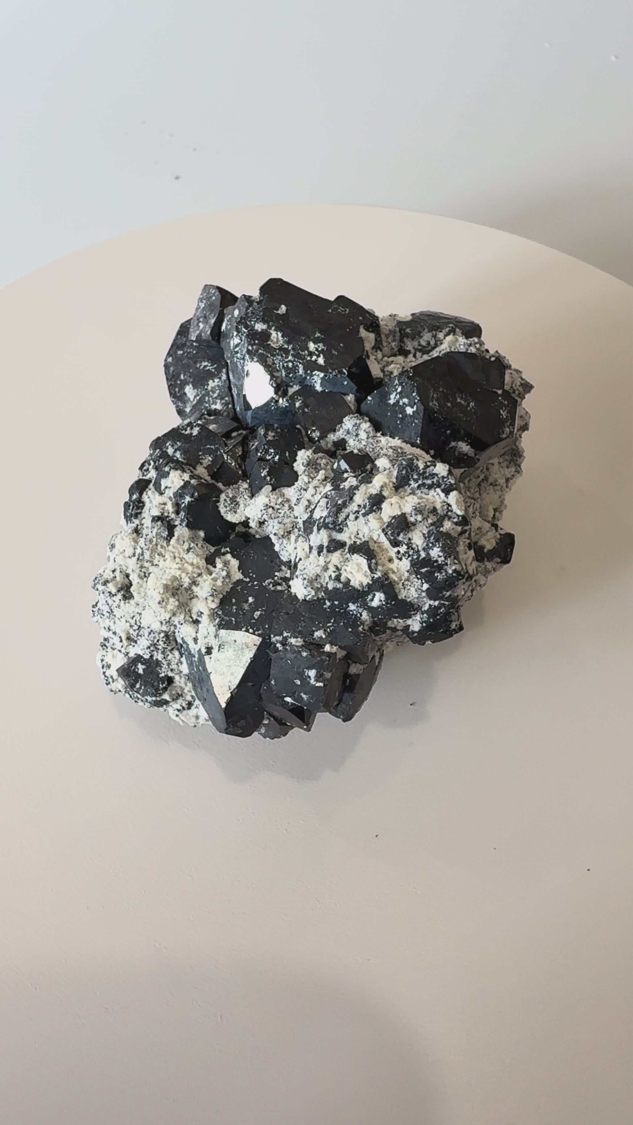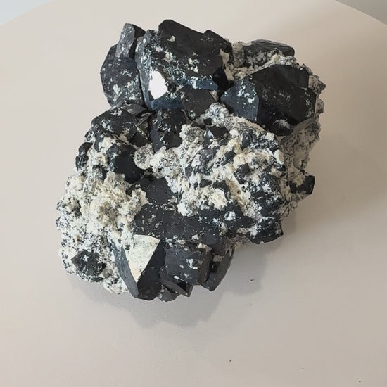 Description: This striking specimen is a cluster of sharp, lustrous cubic and tetrahexahedral magnetite crystals (2) exceeding 1.4cm.! The specimen has multiple large crystals and dozens or smaller complete crystals in a friable halite/talc matrix. The crystal edges are crisp, and the symmetry is unmistakable, reflecting magnetite’s isometric crystal system. The crystals stand out for their striking jet‑black coloration and mirror‑like crystal faces that shimmer with metallic brilliance. Their association with white talc/halite (?) provides dramatic contrast, enhancing their aesthetic appeal. These stunning cubic crystals are from the ZCA No. 4 Mine in Balmat, St. Lawrence County, a locality renowned for producing some of the finest magnetite specimens in the world. These specimens are no longer being mined and are difficult to find on the market today. High-quality pieces are considered museum-grade.
