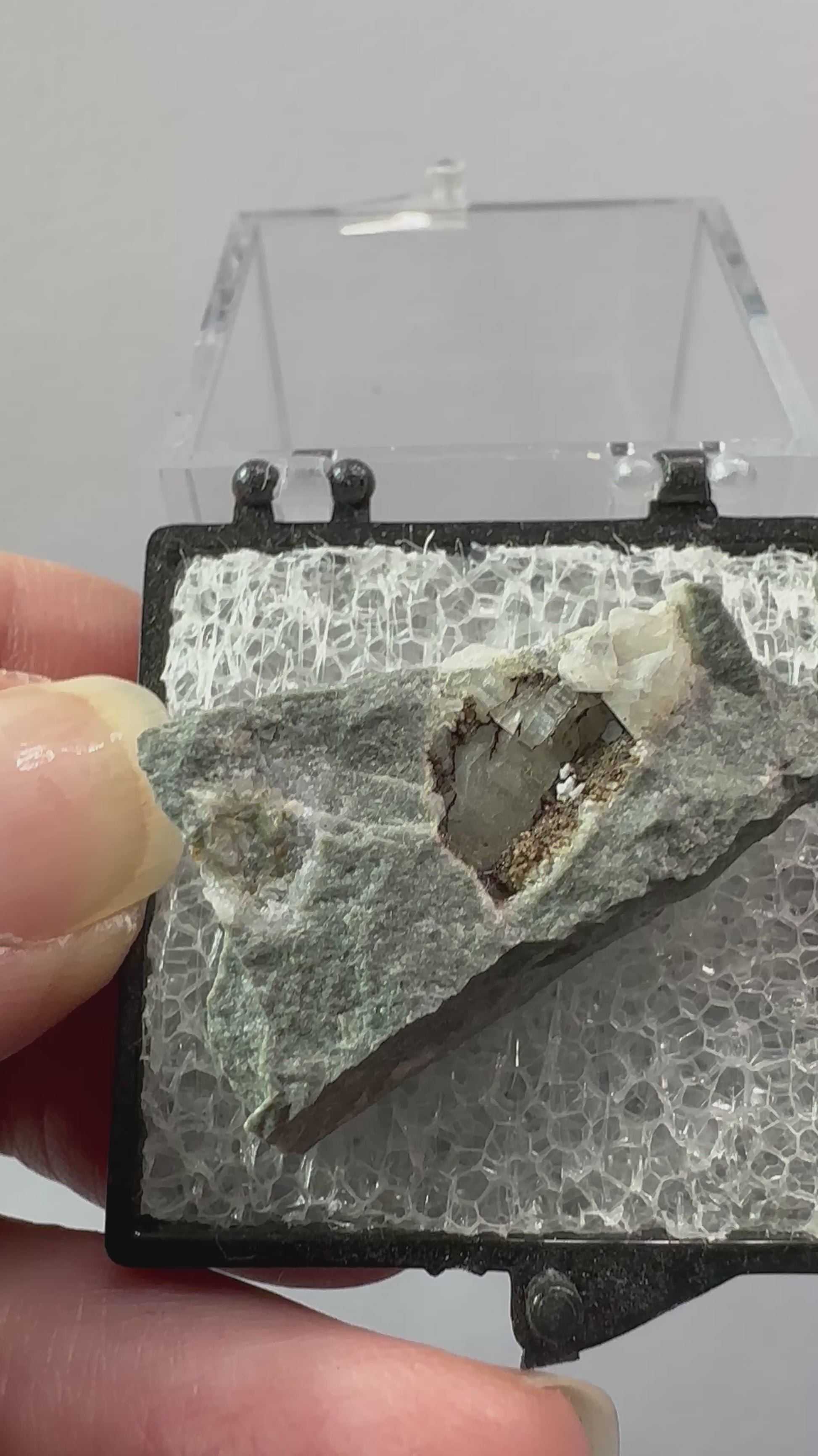 Description: An individual clear to white Weloganite crystal in a cavity with a quartz rim. The Weloganite crystal has growth striations. Weloganite is extremely rare, with good specimens of this strontium, sodium, zirconium carbonate increasingly difficult to obtain. Weloganite was first identified in the 1960’s and the Francon Quarry is the type locality. The quarry has been inactive since 1981 and will never be active again. It is in the central part of the city of Montréal (pop. over 2.5 million), in a residential area, and owned by the City.