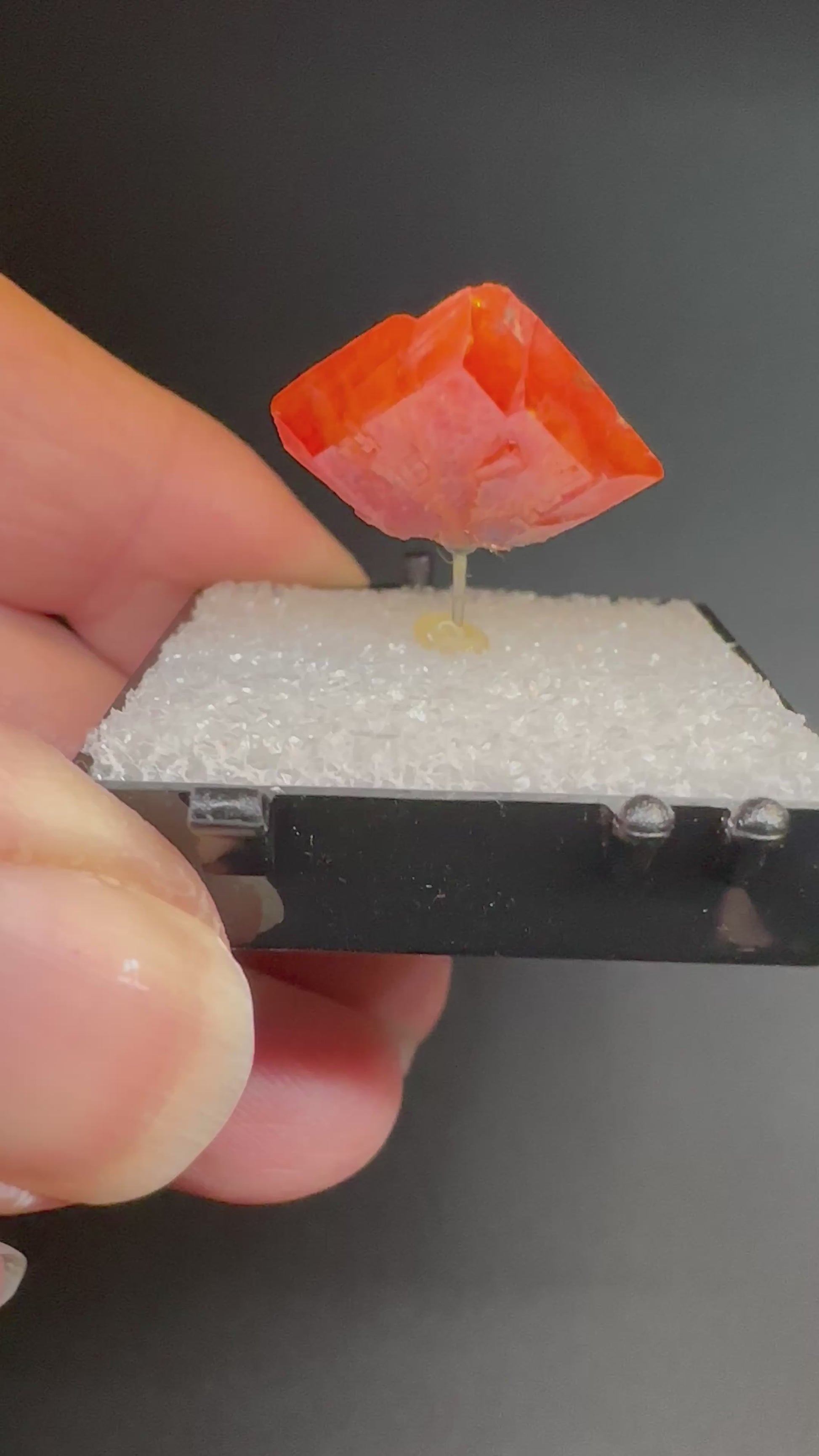 Description: A spectacular single crystal of Wulfenite from the famous Red Cloud Mine. The crystal is a deep red/orange colour with growth ridges on the crystal faces. The crystal is in excellent condition with microchips on the crystal edges – a classic.